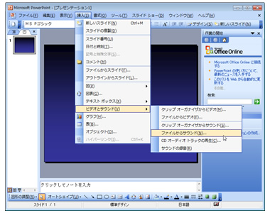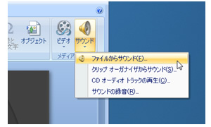 メニューから[挿入]→[ビデオとサウンド]をクリックし、[ファイルからサウンド]を選択します。
