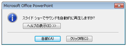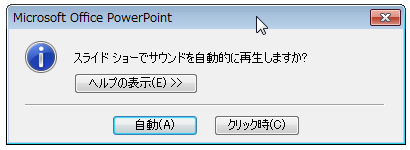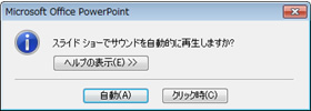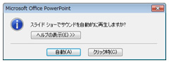 挿入するファイルを選択したら<OK>をクリックします。その後、表示されるダイアログボックスで、<自動>または<クリック時>のどちらかをクリックします。スライド表示と同時に再生する場合には<自動>を、サウンドアイコンをクリックした時に再生する場合には<クリック時>を選択しましょう。