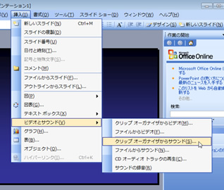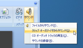 メニューから[挿入]→[ビデオとサウンド]をクリックし、[クリップオーガナイザからサウンド]を選択します。