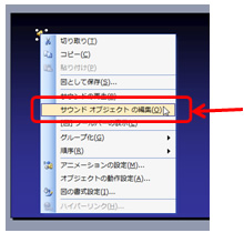 挿入したサウンドアイコンを右クリックし、[サウンドオブジェクトの編集]を選択します。