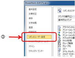 ③[PowerPointのオプション]ダイアログボックスで、[リボンのユーザー設定]をクリックします。