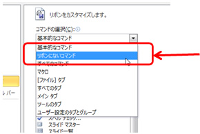 ⑩[コマンドの選択]ドロップダウンリストから[リボンにないコマンド]または[すべてのコマンド]を選択します。