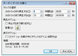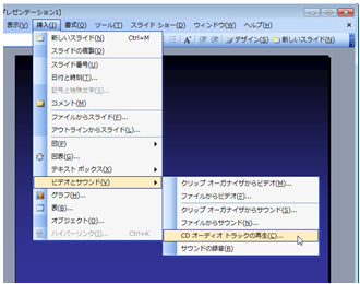 メニューから[挿入]→[ビデオとサウンド]をクリックし、[CDオーディオ トラックの再生]を選択します。
