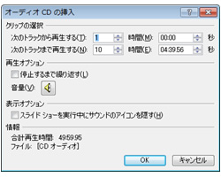[オーディオCDの挿入]ダイアログボックスで、再生するトラックの範囲を設定します。必要に応じて[再生オプション]と[表示オプション]を設定したら、<OK>をクリックします。