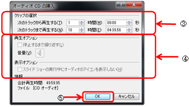 ③[オーディオCDの挿入]ダイアログボックスで、再生するトラックの範囲を設定します。