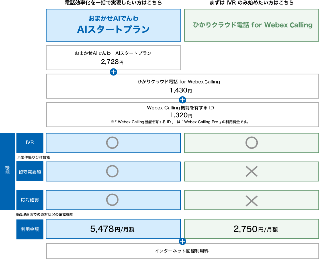 『おまかせAIでんわ』サービスについて、シンプルプランは、『ひかりクラウド電話 for Webex Calling』の機能で提供いたします。 AIスタートプランは、『ひかりクラウド電話 for Webex Calling』に『おまかせAIでんわ(AIスタートプラン)』の機能を提供いたします。AIスタートプランは『ひかりクラウド電話 for Webex Calling』と『おまかせAIでんわ』の機能を合わせて提供いたします。