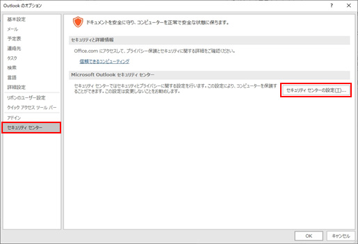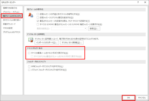 3. [セキュリティセンター]画面内の[電子メールのセキュリティ] をクリックし、「テキスト形式で表示」欄の[すべての標準メールをテキスト形式で表示する]と、[すべてのデジタル署名されたメールをテキスト形式で表示する]のチェックを外して、[OK]をクリックします。