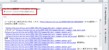 メールに「このメッセージはテキスト形式に変換されました」と表示されている場合は、クリックして「HTMLとして表示」を選択することで、HTML形式に変換できます。