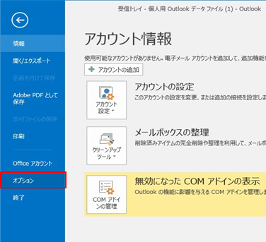 1. Outlookの[ファイル]メニュー → [オプション]をクリックします。