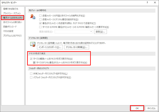 3. [セキュリティセンター]画面内の[電子メールのセキュリティ] をクリックし、 「テキスト形式で表示」欄の[すべての標準メールをテキスト形式で表示する]と、[すべてのデジタル署名されたメールをテキスト形式で表示する]にチェックを入れて、[OK]をクリックします。