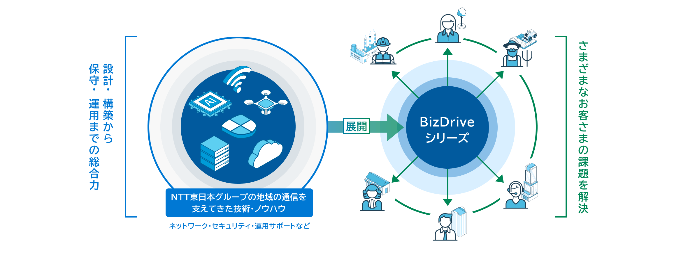 BizDrive(ビズドライブ)シリーズとは、NTT東日本がお客さまの課題に合わせて提供するソリューション群の総称です。