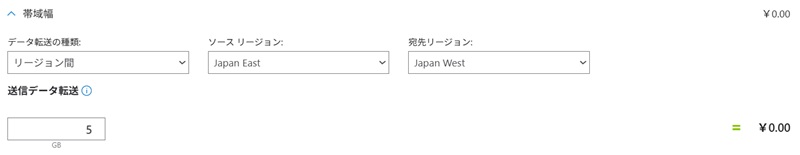 最後に、帯域幅(データ転送量)を設定します。Azureではデータセンターからの送信データ転送に費用が発生し、受信データ転送は無料です。毎月最初の5GBまでは無料で利用できます。今回は5GBとして設定します。