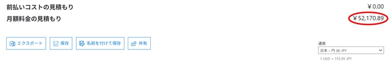 今回設定した条件では、Azureの利用料金は 約52,170円/月 となりました。見積もり内容は「保存」ボタンから保管できるため、他の構成パターンとの比較や社内共有にも便利です。