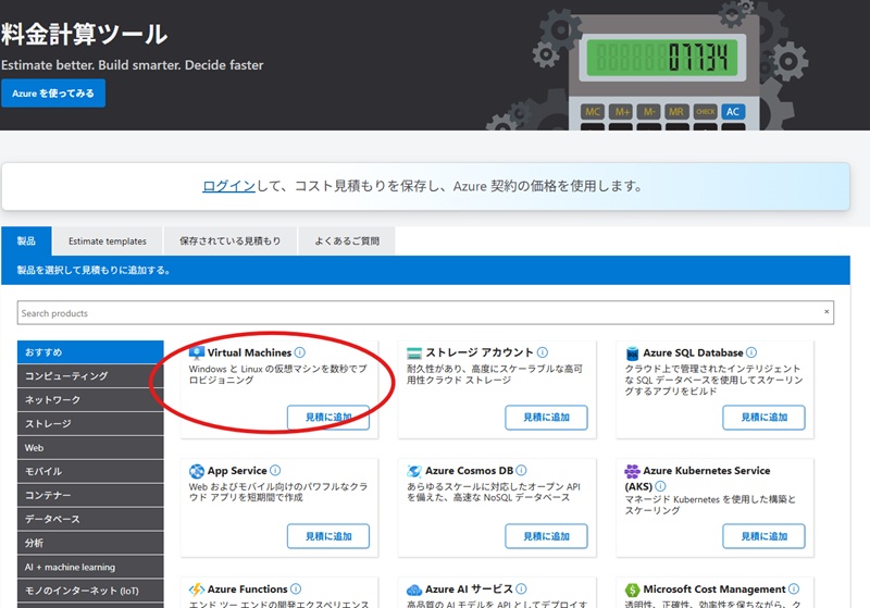 料金計算ツールの利用は、まず見積もり対象となるサービスを選択するところから始まります。トップページには、仮想マシンやデータベースなどAzureで利用可能なサービスがカテゴリ別に並んでおり、必要なサービスをクリックすると「見積もりリスト」に追加される仕組みです。