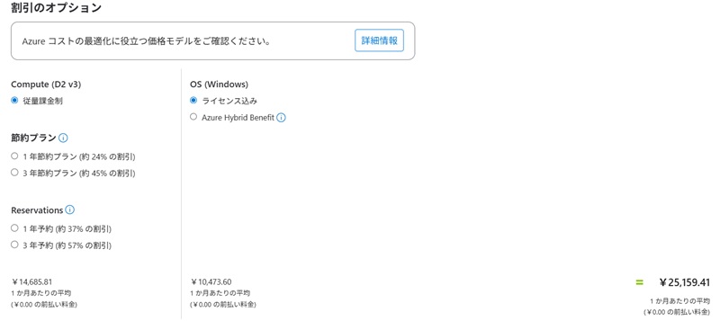 続いて、オプション設定として価格体系やライセンスの扱いを設定します。今回は月々の利用量に応じて料金が変動する従量課金制を選択しますが、1年・3年の予約利用を選ぶと割引が適用されます。OSライセンスは「ライセンス込み」を選択しました。オンプレミスのライセンスをクラウドで継続利用する場合は「Azure Hybrid Benefit」を選択します。