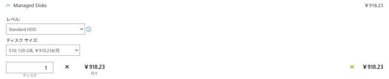 さらに、Managed Diskの設定では、ディスクの種類・サイズ・台数を指定します。今回は「Standard HDD」「128GiB」「1台」で進めます。SSDのほうが性能は高いものの費用も上がるため、用途に合わせて選択が必要です。容量が大きいほど料金が上がる点にも注意しましょう。