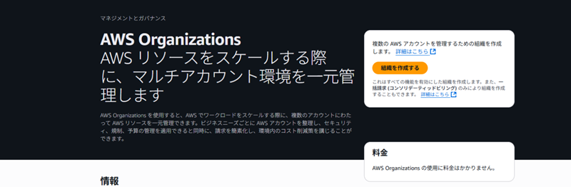 AWSマネジメントコンソールからAWS Organizationsを開き、「組織を作成する」ボタンをクリックして、組織を作成します。