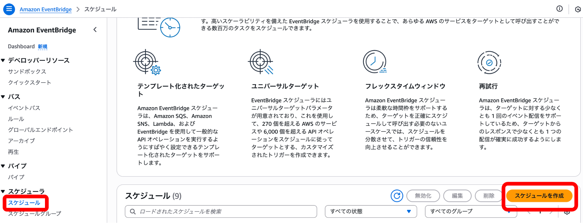 1. マネジメントコンソールで「EventBridge」→「スケジューラ」→「スケジュールを作成」を選択