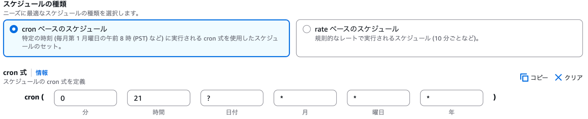 Cronベースは日時指定を行う場合、レートベースは12時間毎など規則的な単位で行う場合に使い分けることがおすすめです以下の設定の場合、毎日21時にこの後設定する動作をトリガーさせることになります。