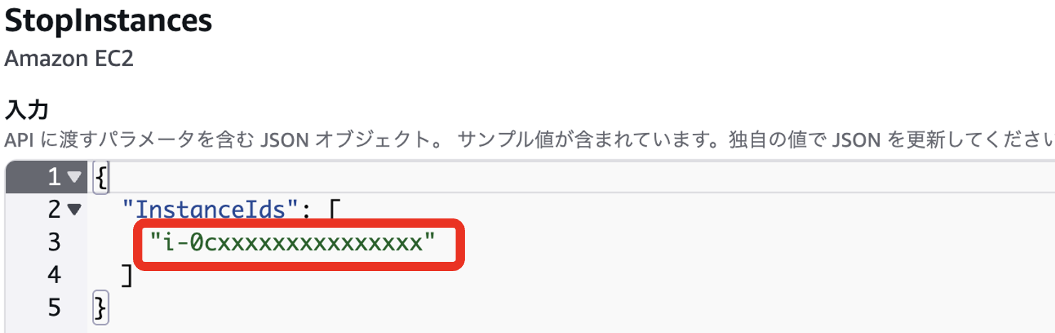 ターゲットの詳細にてターゲットAPIを「Amazon EC2」の「StopInstances」に設定し、「InstanceIds」に対象のインスタンスIDを設定します。