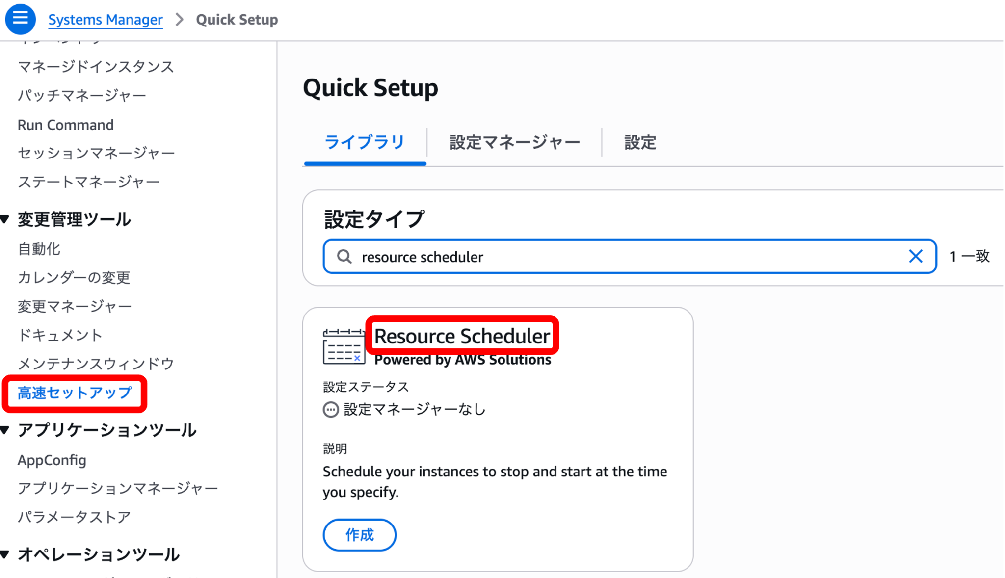- マネジメントコンソールで Systems Manager → 「高速セットアップ」を開く