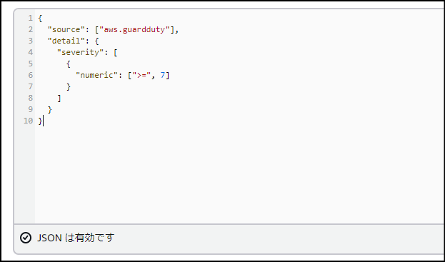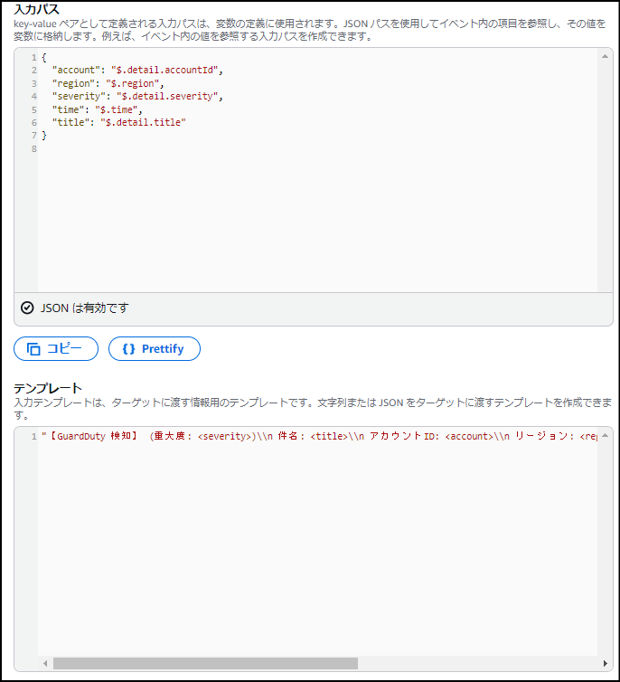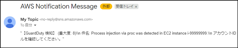 もしこの設定を省略すると、EメールにはGuardDutyが発行した巨大なJSONデータがそのまま送られてきます。これでは非常に読みにくく、何が問題なのかを瞬時に把握しづらくなります。