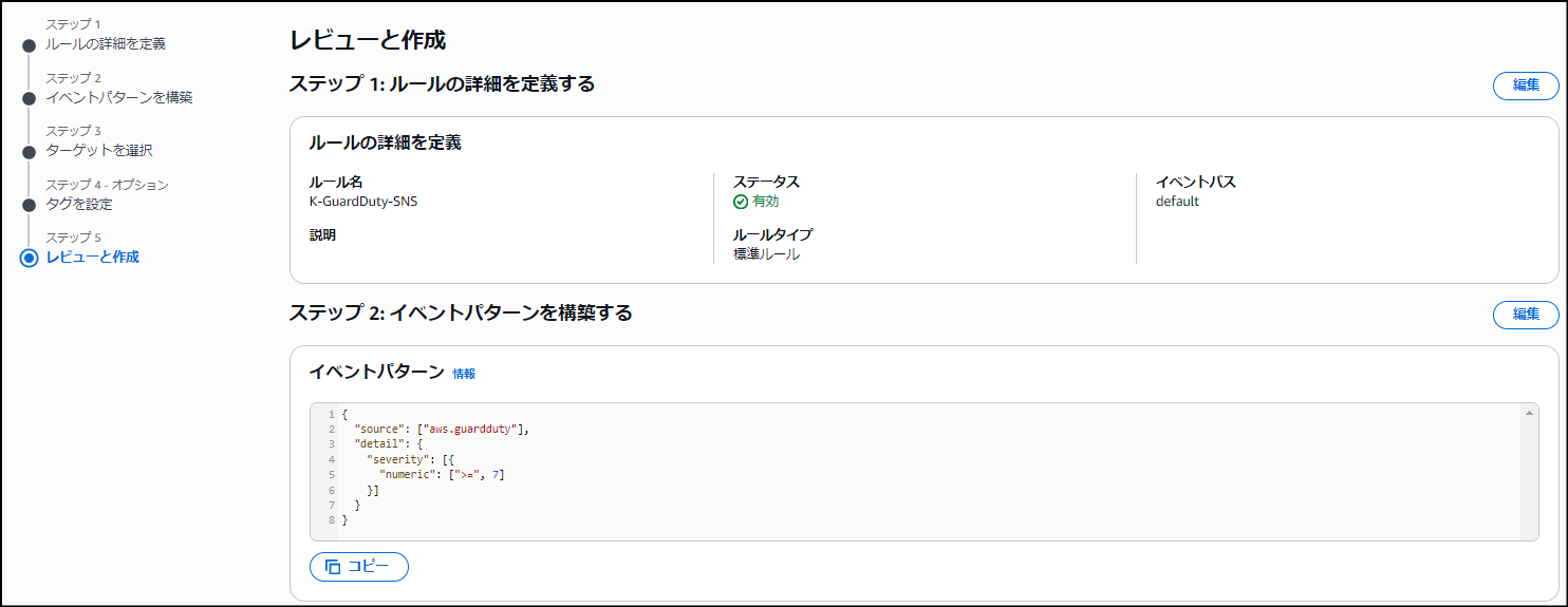 次に、GuardDutyからの検知イベントをキャッチして、先ほど作成したSNSトピックへ、転送するためのルールを作成します。この設定には Amazon EventBridge を利用します。全部で6ステップとなります。