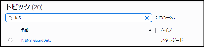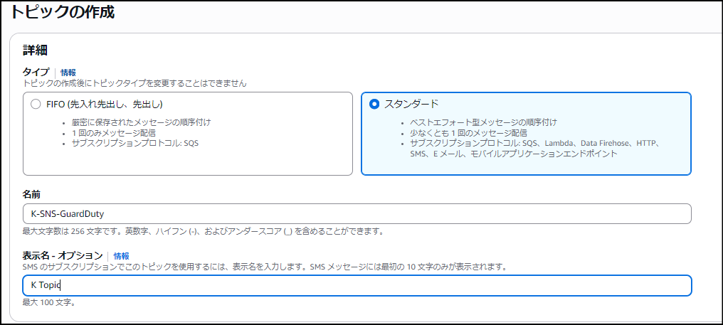 まず「名前」の入力欄に、わかりやすい名前を付けます (例: K-GuardDuty-SNS)。
