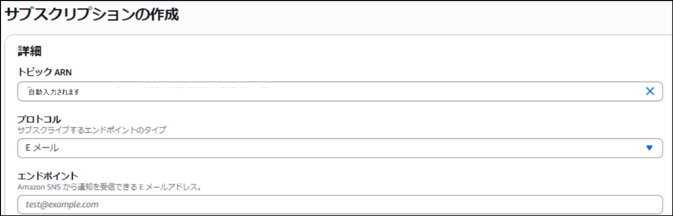 「トピック ARN」は、先ほどのトピックが自動で入力されるはずです。自動入力無ければ検索して、入力します。