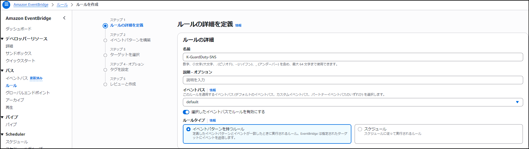 「イベントバス」は default のままで進めましょう。GuardDutyは標準で、この default イベントバスにイベントを送信するようになっているためです。