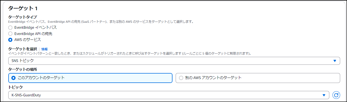 - ターゲットを選択のドロップダウンから、「SNS トピック」を選びます。