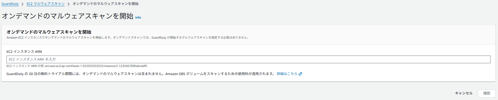 以下画面に遷移するため、スキャンを実行するEC2インスタンスARNを入力し、[確認]をクリックします。