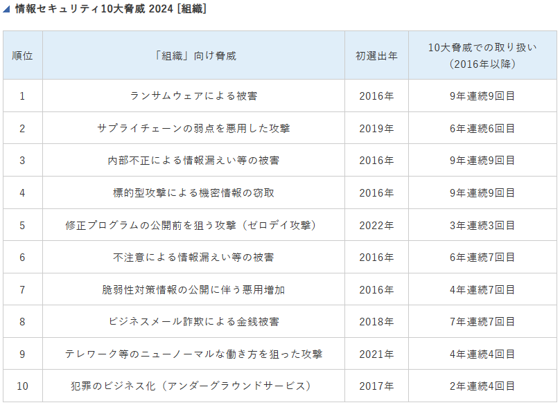 なぜマルウェア対策が必要なのでしょうか?IPA(独立行政法人情報処理推進機構)が公開している「情報セキュリティ10大脅威 2024」を見ると、組織における脅威の上位にマルウェアに関連する項目がランクインしています。