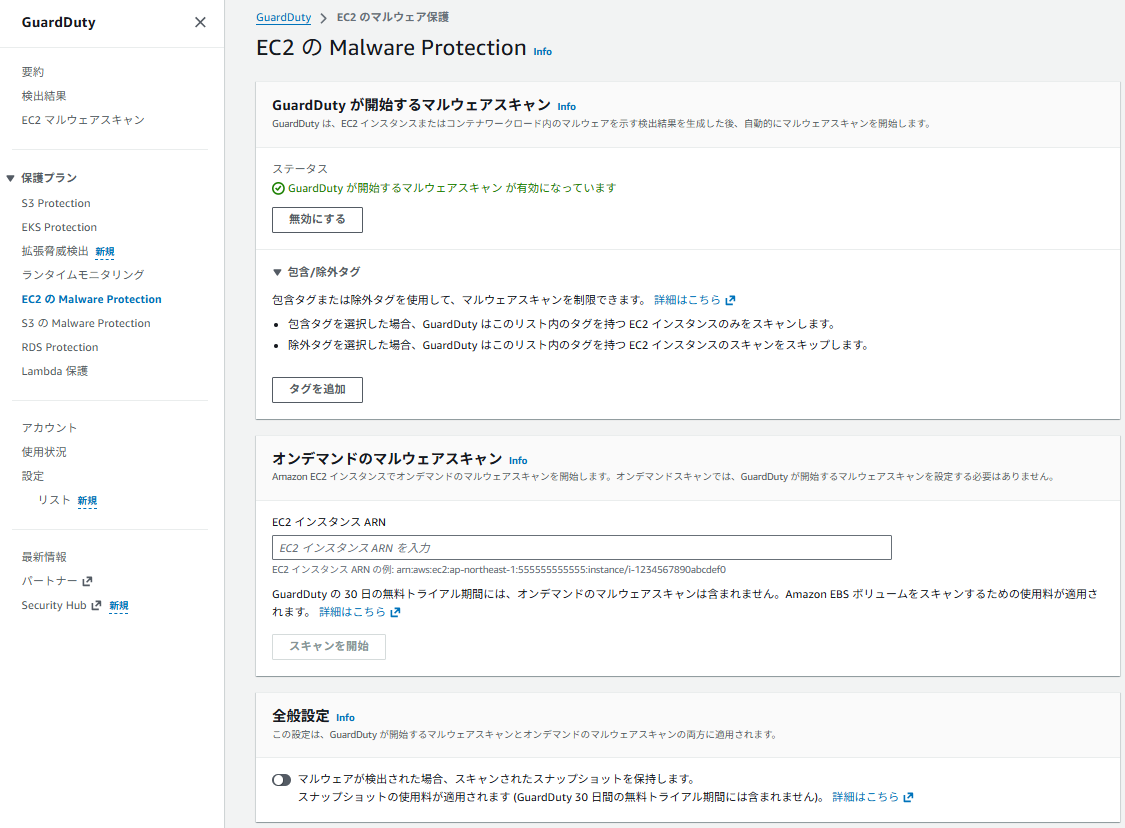 GuardDutyコンソールの左側メニューから[保護プラン]-[EC2のMalware Protection]を選択することで、設定の確認や変更が可能です。