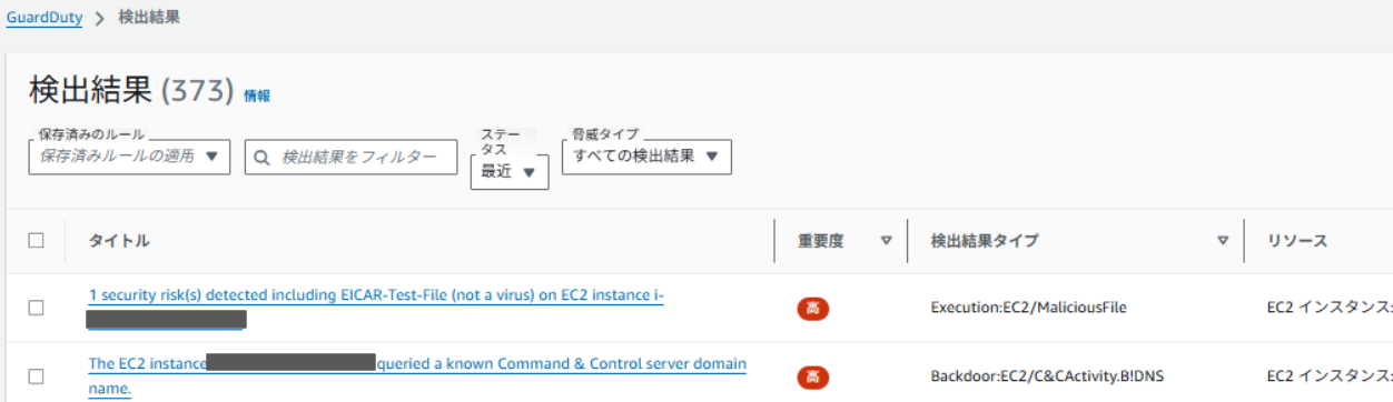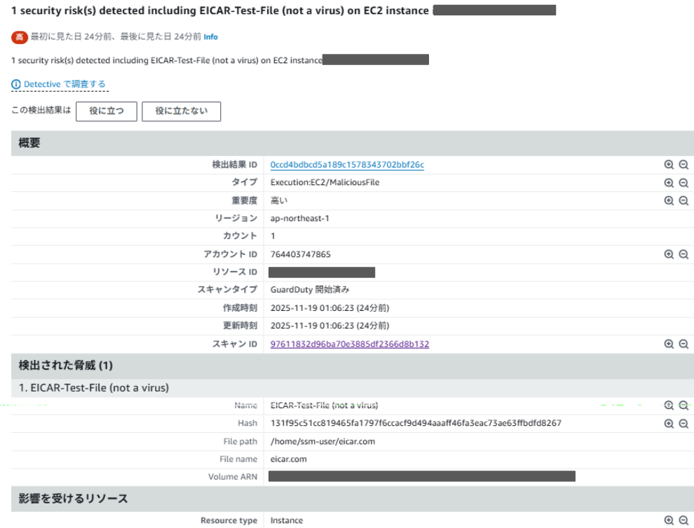 GuardDutyの[検出結果]画面で検知した脅威の情報も確認可能です。今回のテストでは、EICARテストファイルが脅威として検出されていることが分かります。