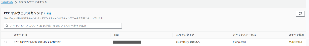 GuardDutyの[EC2マルウェアスキャン]画面で自動スキャンおよびオンデマンドでのスキャン結果を確認することができます。