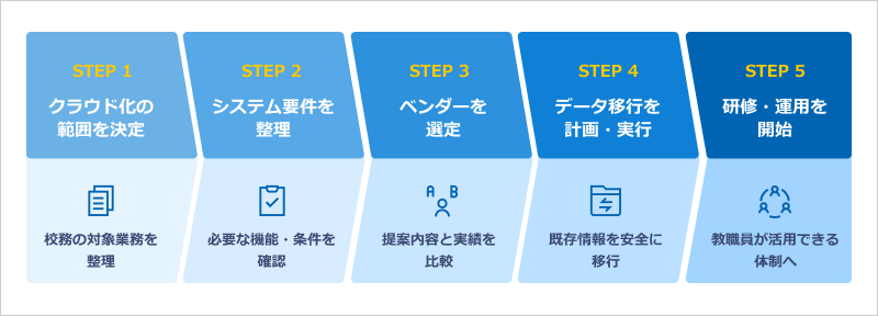 校務のクラウド化は、単にシステムを入れ替えるだけでなく、業務フロー全体を見なおす大規模なDXプロジェクトです。ここでは、スムーズで確実な移行を実現するための具体的なステップを5つにわけて解説します。