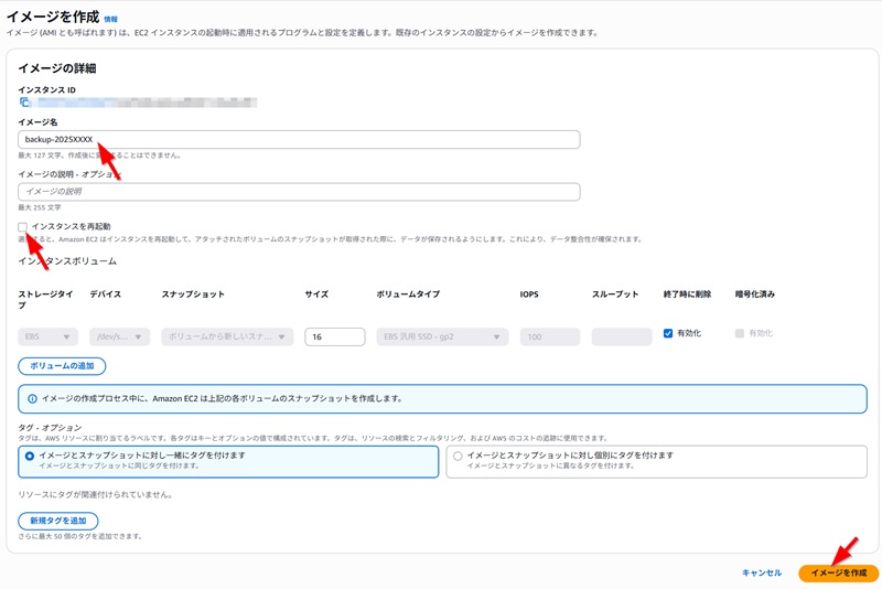具体的な復旧作業(特に再起動や設定変更)を行う前に、必ず現在のサーバーの状態を保存してください。 「バックアップが取れているか分からない」「担当者が不在」という場合は、迷わず手動でバックアップ(AMI)を作成します。