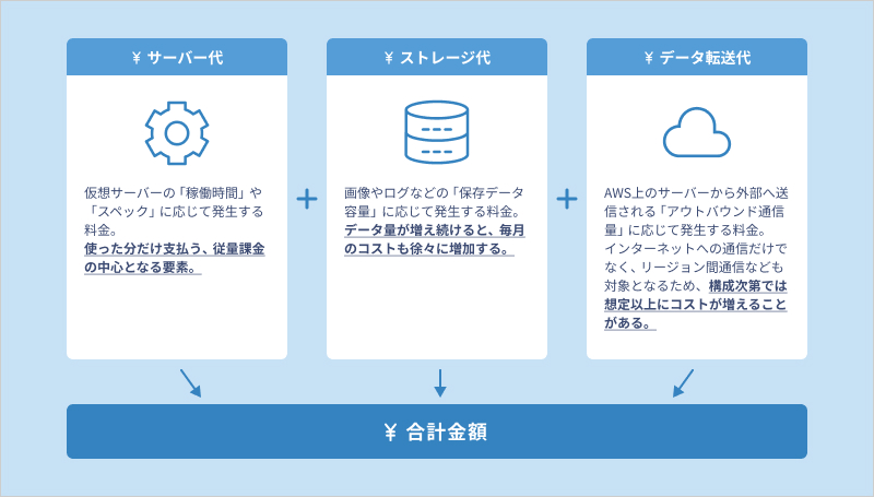 この章では、請求額の大部分を占め、システムの構成や利用状況によって支払額に大きな差が生じやすい「サーバー」「ストレージ」「データ転送」の3要素に絞って、それぞれの仕組みを解説します。