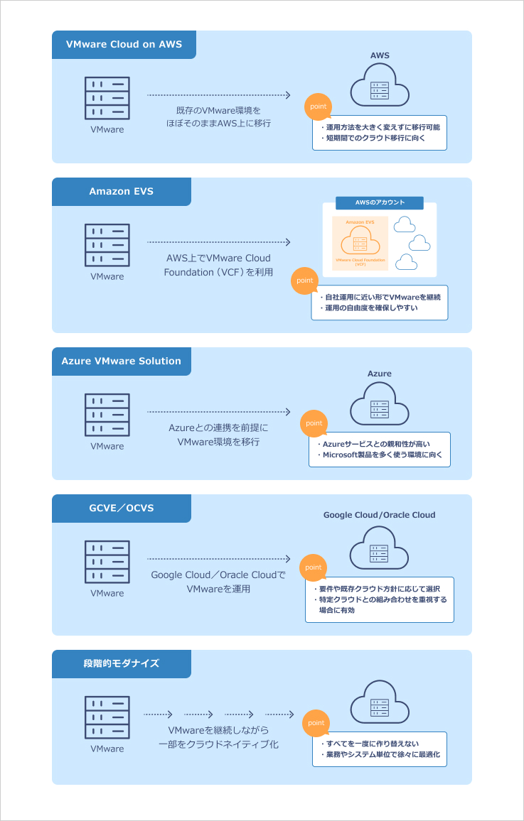 ここでは、VMwareのクラウド移行における代表的な選択肢と、それぞれが向いているケースについて解説します。