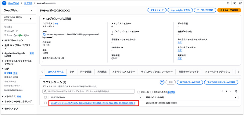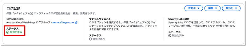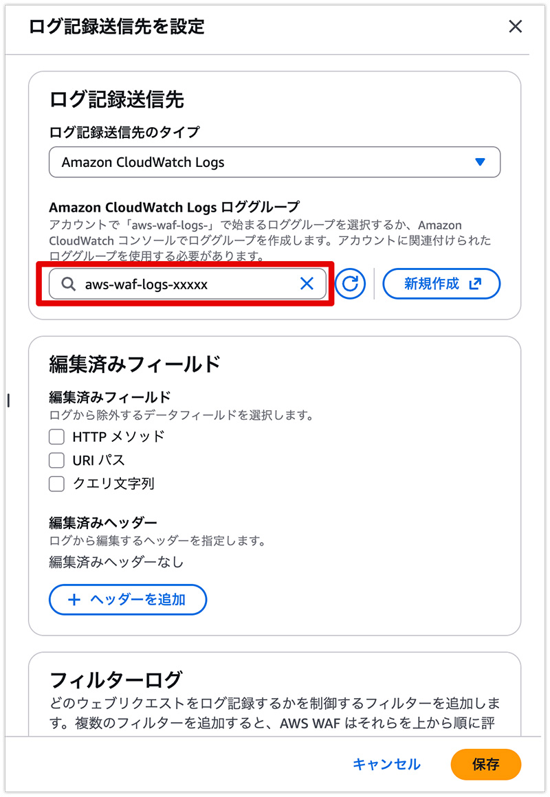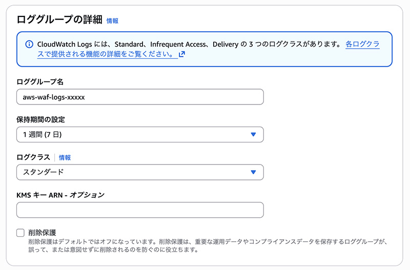 - ロググループ名の例: aws-waf-logs-my-web-acl