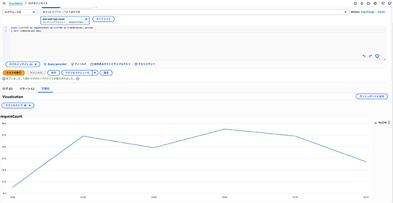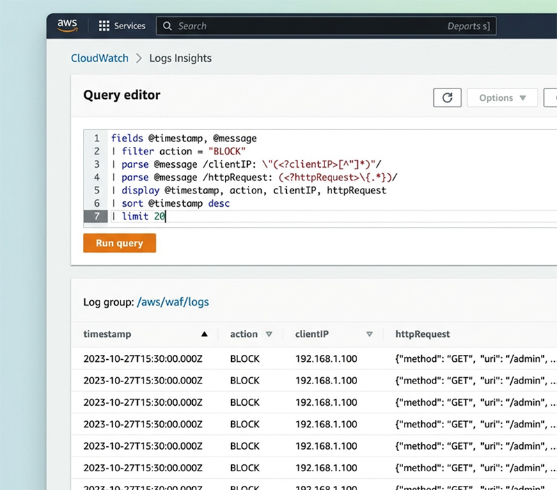 - Logs Insightsで SQLライクなクエリを実行でき、「特定のIPからのアクセス数」「ブロックされたリクエスト一覧」などを数秒で可視化できます。