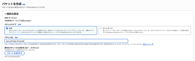 - (S3への直接出力の場合)バケット名の例: aws-waf-logs-archive-2024