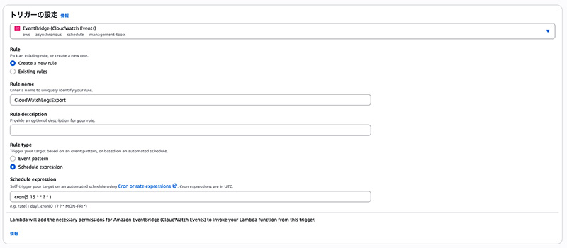 「設定」→「トリガー」→「トリガーを追加」→「EventBridge (CloudWatch Events)」を設定