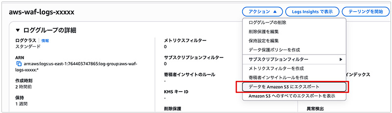 1. CloudWatch LogsからS3格納のためのバケットポリシーの正当性を確認するため、まずは手動でエクスポートを実施してください。