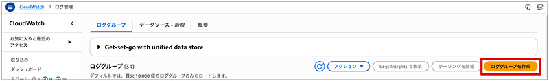 1. 「CloudWatch」 → 「ログ管理」 → 「ロググループを作成」をクリックし、上記命名規則に従ったロググループを作成します。