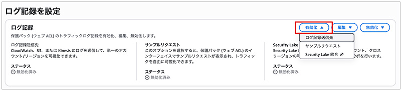 6. 「ログ記録」から「有効化」→「ログ記録送信先」をクリックします。