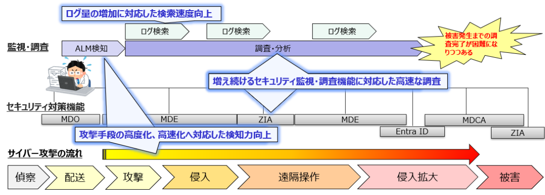 さらに、SIEMはログ保持だけでなく、調査スピードの向上にも貢献します。従来のポータルではログ検索に時間がかかることがありましたが、SIEMにより迅速かつ効率的な調査が可能となり、対応のスピードが向上し、サイバー攻撃による被害の最小化につながります。