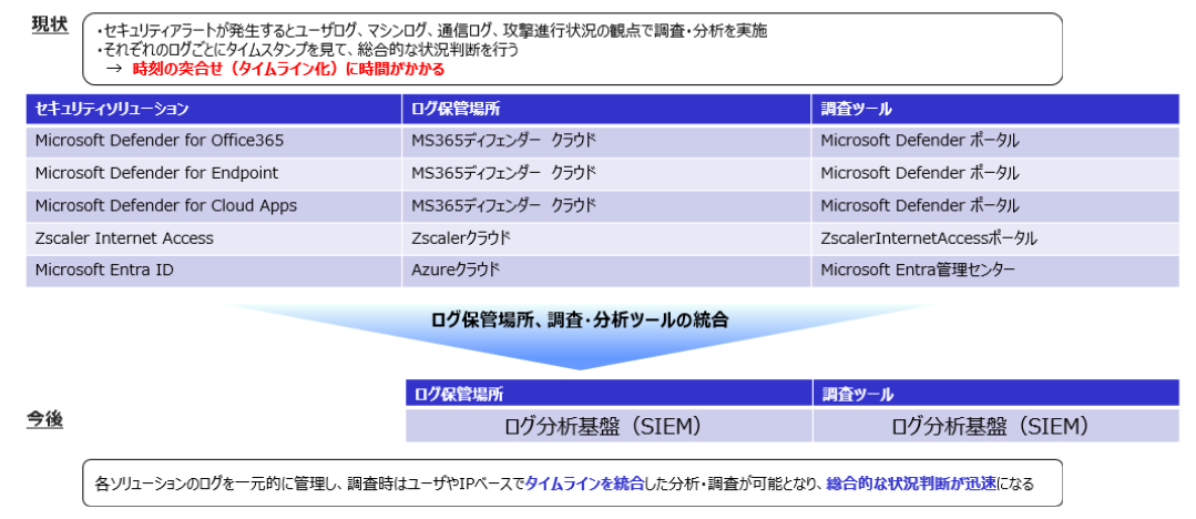しかし、これらの製品は独立していることが多く、アラート確認やログ調査のために複数のポータルを行き来する必要があるという課題がありました。NTT東日本でも、Microsoft製品はDefender for XDRで一元管理できるものの、ZscalerやEntra IDは別ポータルを使用しており、最大3つのサイトを横断して相関分析を行っていました。