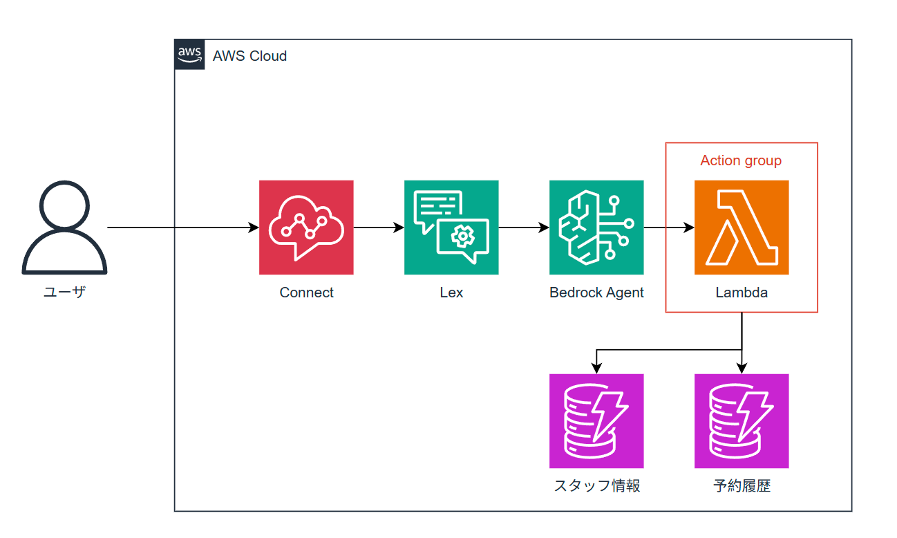 Amazon ConnectとAmazon Lexが通話を受け付け、Bedrock Agentがユーザーの発話を解析します。